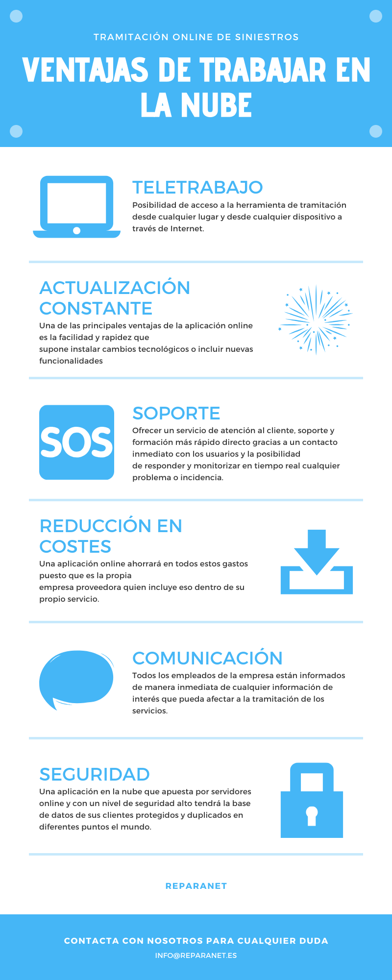- Seguridad: Tal y como hemos analizado anterior, una herramienta de gestión que requiere de servidores físicos implica el disponer de todos los datos de la empresa en un mismo punto físico. Una aplicación en la nube que apuesta por servidores online y con un nivel de seguridad alto tendrá la base de datos de sus clientes protegidos y duplicados en varias máquinas que se encuentran repartidas en diferentes puntos del mundo. En Reparanet, somos partners de Amazon Web Service, una de las empresas más reputadas en materia de gestión online de datos y que nos certifica en seguridad de datos y gestión de servidores.